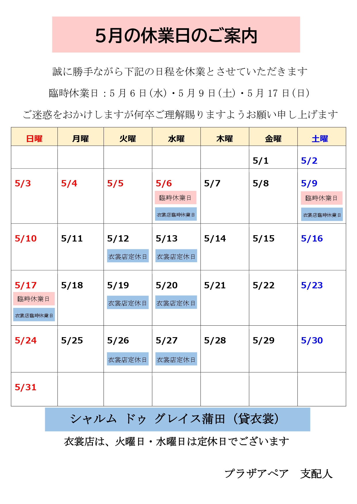 誠に勝手ながら、下記日程にて休館日とさせていただきます。